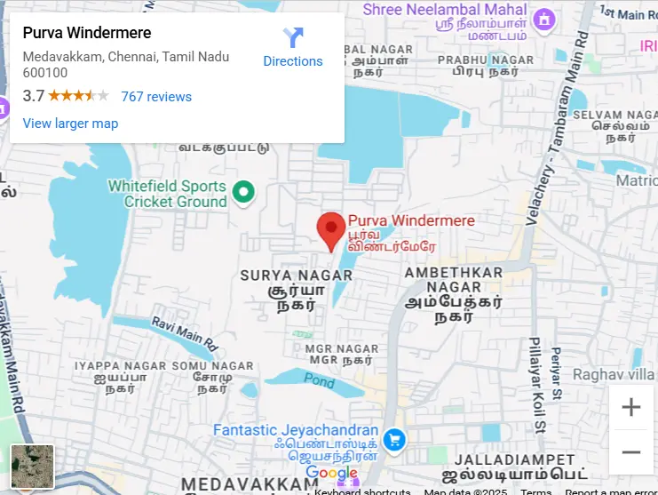 Purva Windermere is about 20 minutes from Velachery and 15 minutes from OMR, making it perfect for those working in IT hubs.