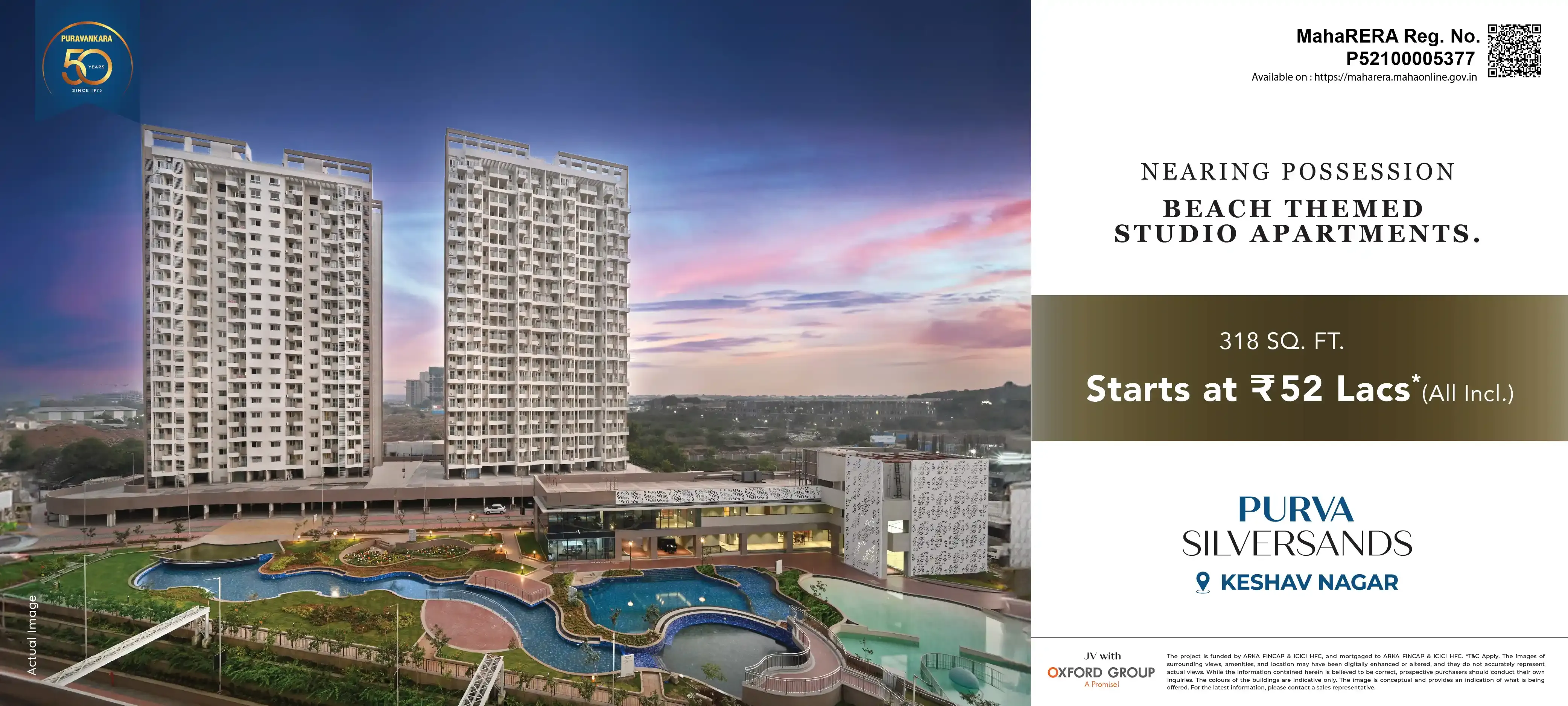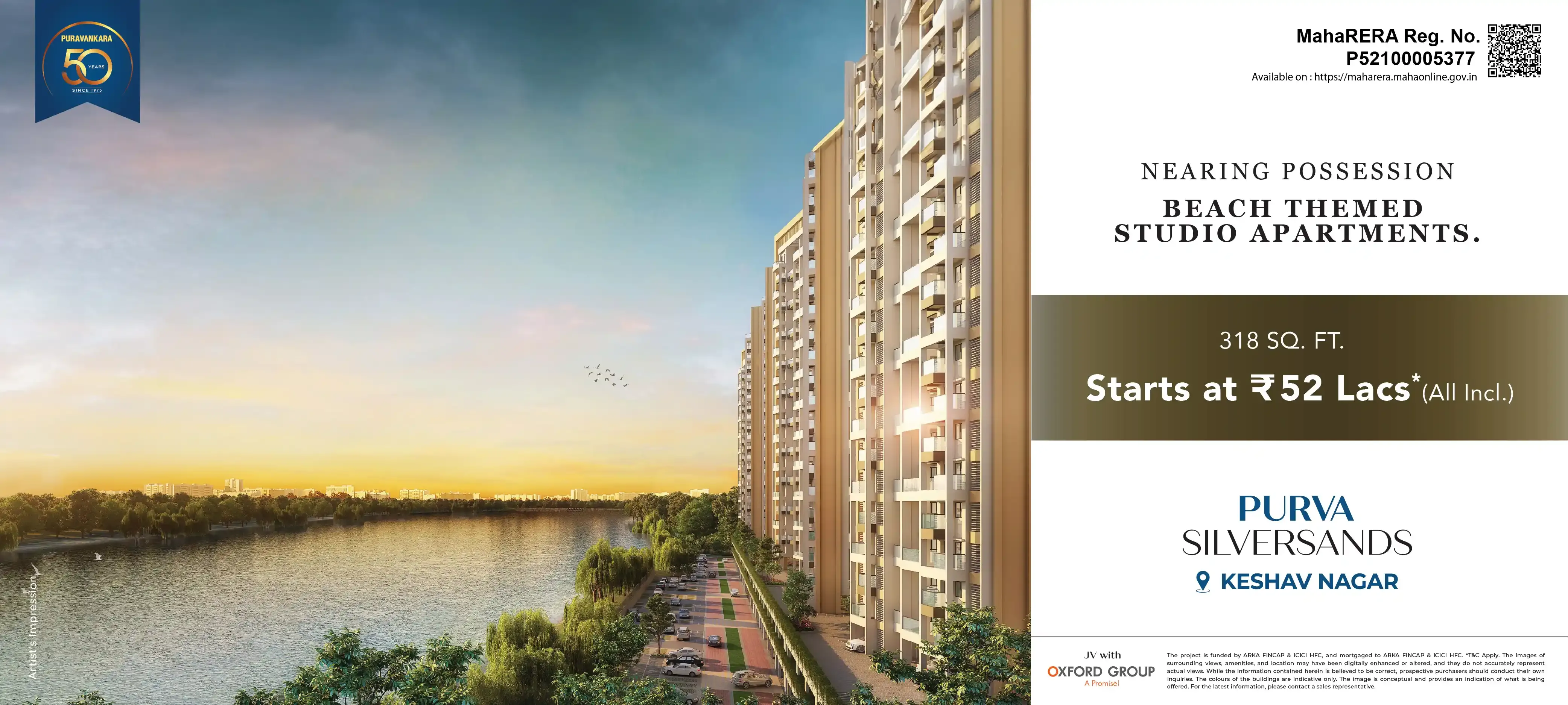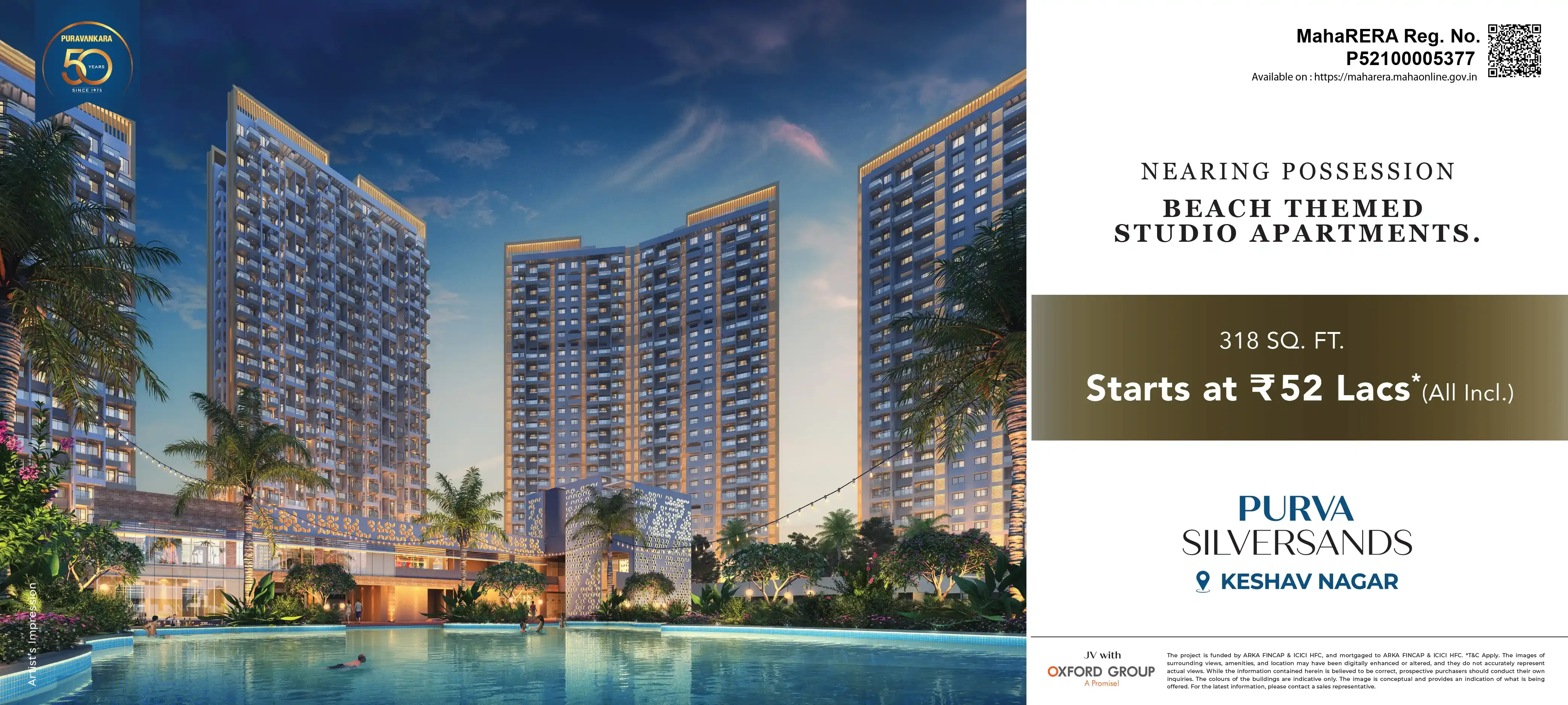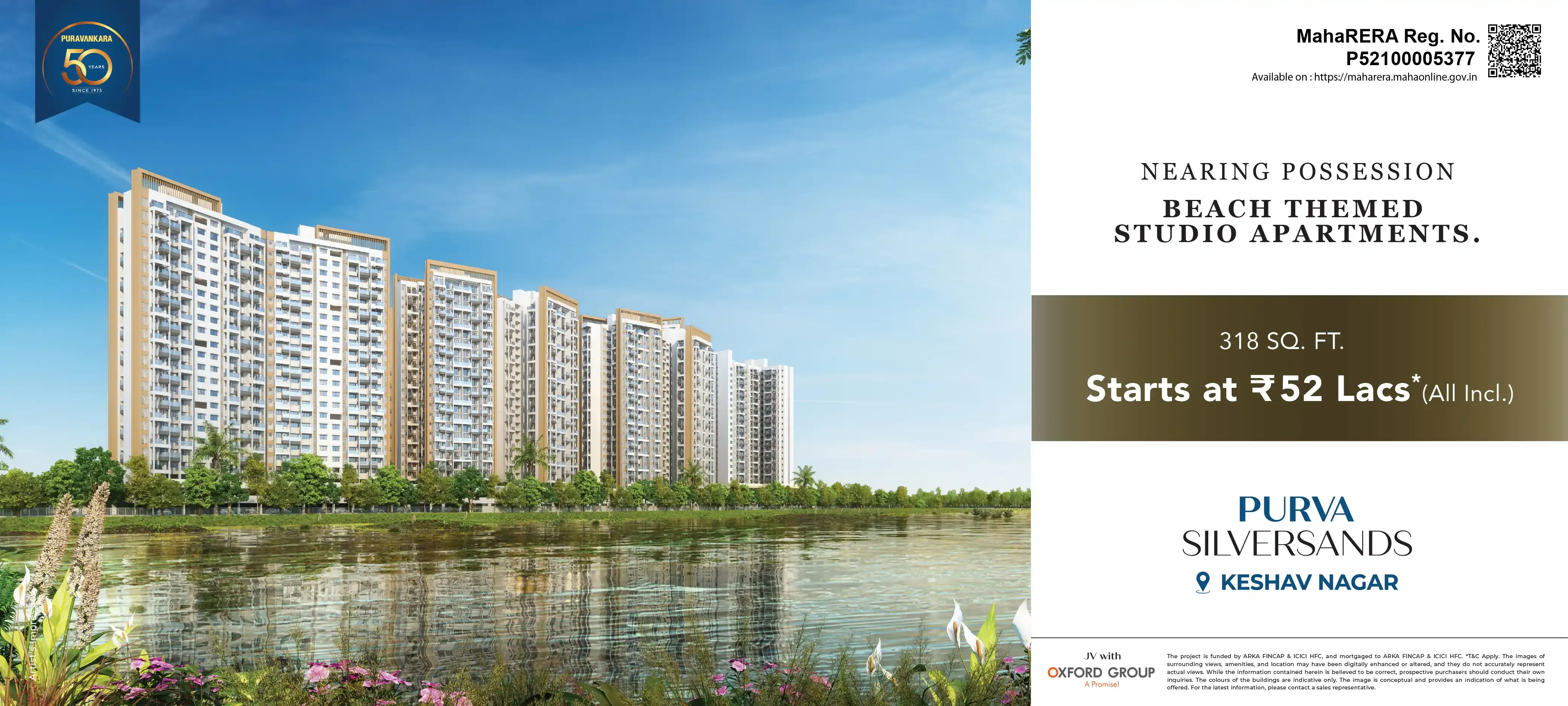 Choose from a range of living spaces, including Studio apartments and managed residences with stunning views of the lagoon, river, golf course, and the city. Say goodbye to the hustle of Pune and embrace the beach lifestyle at Purva Silversands.